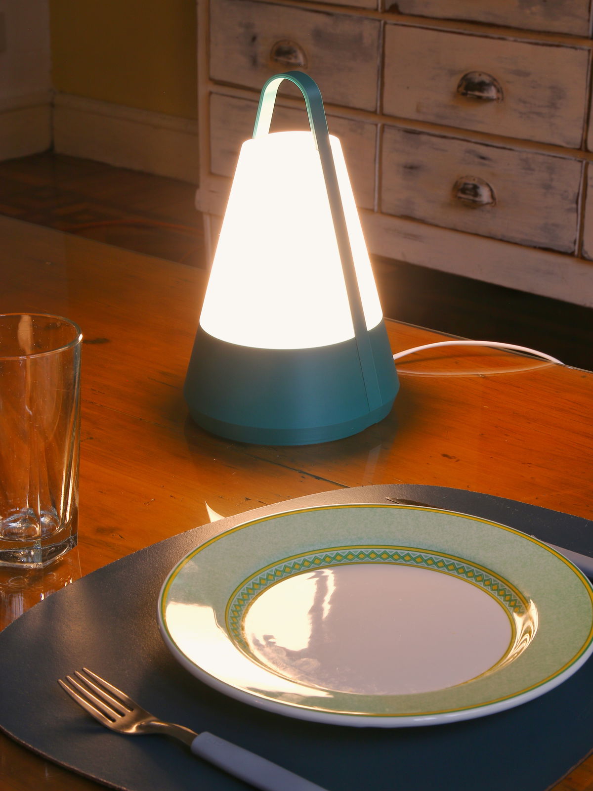 Lámpara de mesa minimalista de estilo contemporáneo. Su forma cónica y su cinta envolvente definen su personalidad y facilitan su manejo.